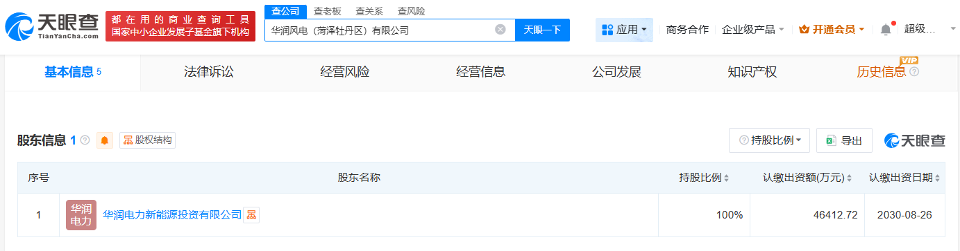 天眼查工商信息顯示,近日,華潤風電(菏澤牡丹區)有限公司成立,法定代表人為趙保建,注冊資本約4.6億人民幣,經營范圍包括風力發電技術服務、太陽能發電技術服務、以自有資金從事投資活動等。股東信息顯示,該公司由華潤電力新能源投資有限公司全資持股。