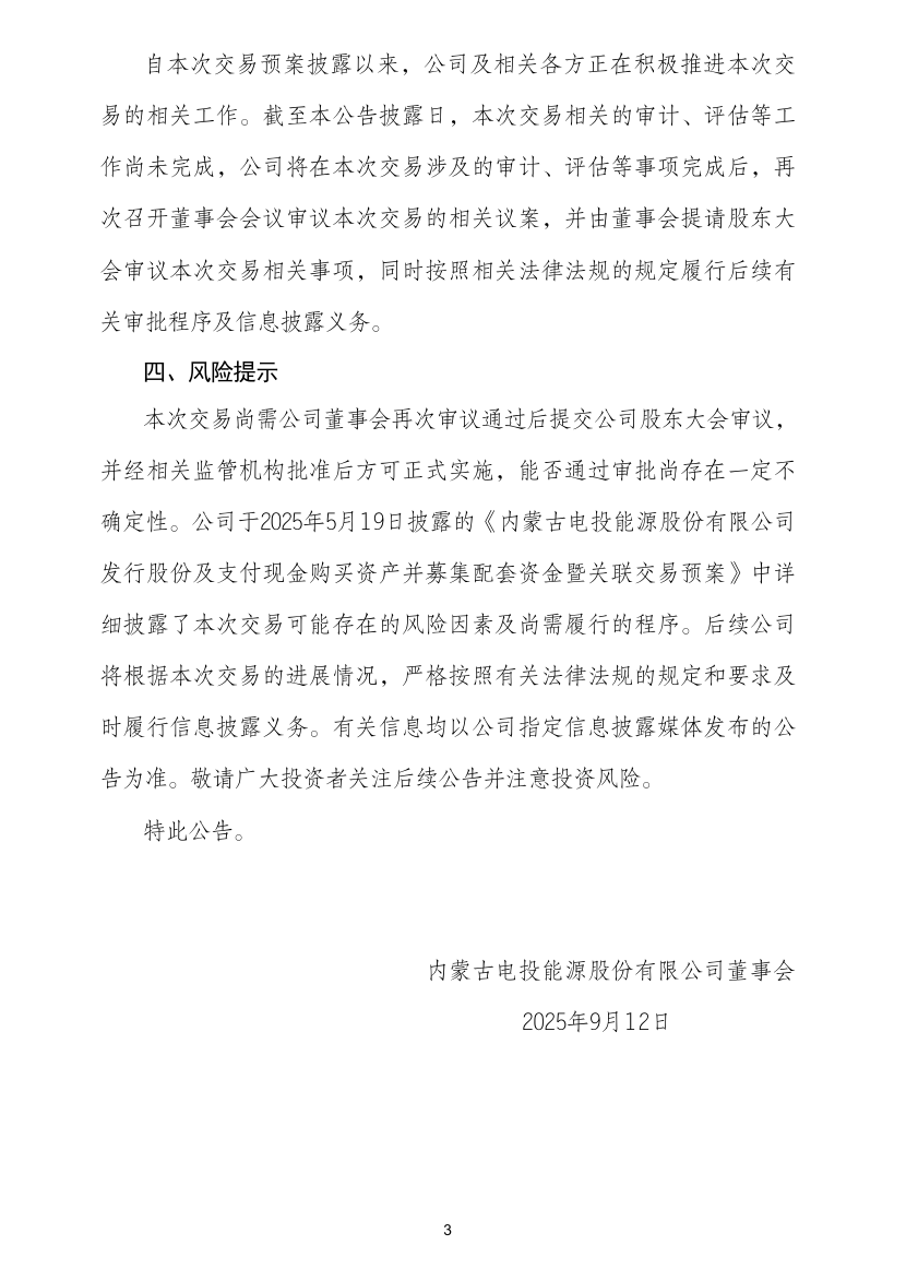 自本次交易預案披露以來,電投能源及相關各方正在積極推進本次交易的相關工作。截至本公告披露日,本次交易相關的審計、評估等工作尚未完成,電投能源將在本次交易涉及的審計、評估等事項完成后,再次召開董事會會議審議本次交易的相關議案,并由董事會提請股東大會審議本次交易相關事項,同時按照相關法律法規的規定履行后續有關審批程序及信息披露義務。