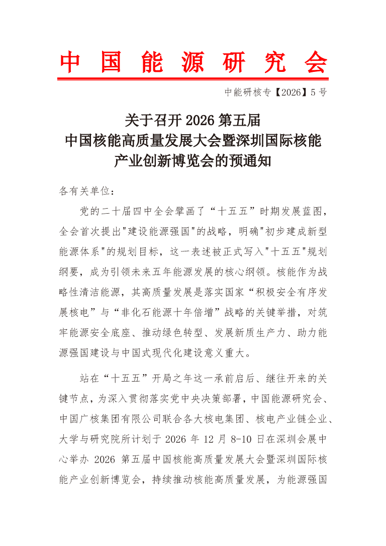 關于召開2026第五屆中國核能高質量發展大會暨深圳國際核能產業創新博覽會的預通知